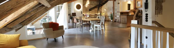 Der Loft zeigt eine stilvolle Einrichtung mit offenem Raum, Holzbalken und viel Licht. Einladende Atmosphäre zum Entspannen.